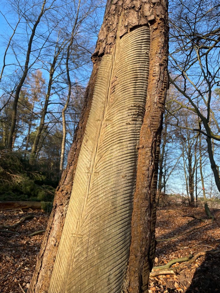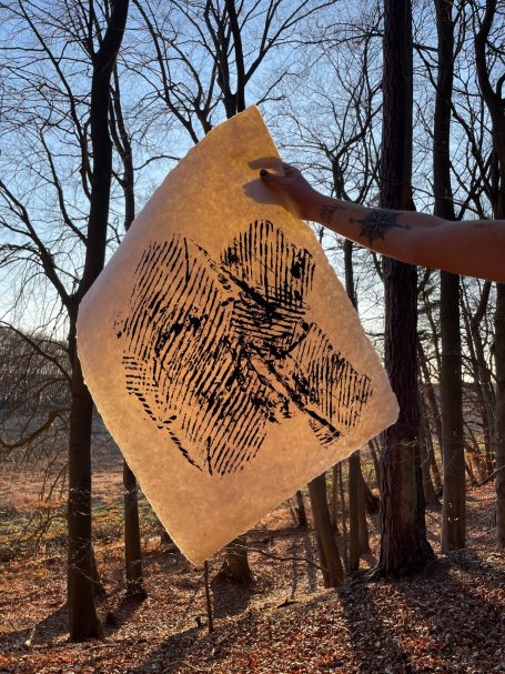 In Brandenburg wurde Harz abgezapft. Dieser kleine Wirtschaftszweig endete abrupt mit der Wende und viele Menschen verloren ihren Beruf. Die Spuren sind bis heute zu sehen an den besonderen Einkerbungen in den Bäumen zur Harzgewinnung. Hier wird eine Tonskulptur angefertigt, die die jeweiligen Muster dokumentiert sowie Papierarbeiten mit Linolfarbe